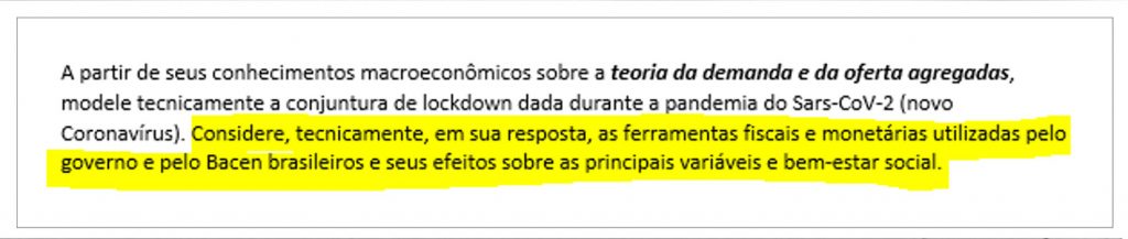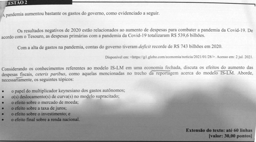 A questão fiscal foi tratada na pergunta número 7. Portanto, alunos e alunas possuíam as principais informações sobre gastos, déficits e ações de governo que foram levadas a cabo durante a pandemia. Veja o enunciado da questão dada em nosso curso: